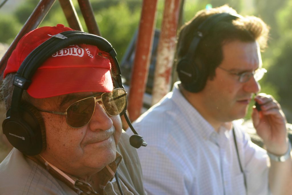 Paolo e il figlio Pier Sandro durante la telecronaca dell’Ardia